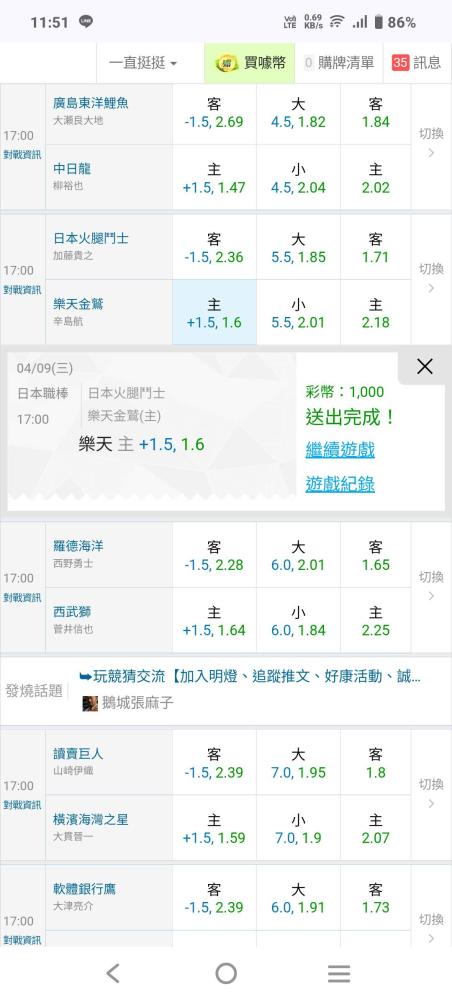 日本職棒 >> 4/8日主推雙倒今天3場4注不怕死的上車輸贏-.-