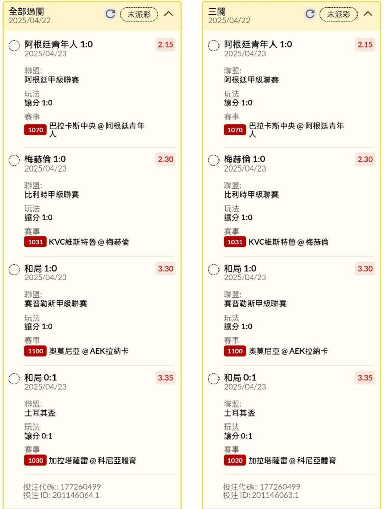 足球 >> 半夜早場讓分串關分享2單試單(4場賽事不同讓分組合)