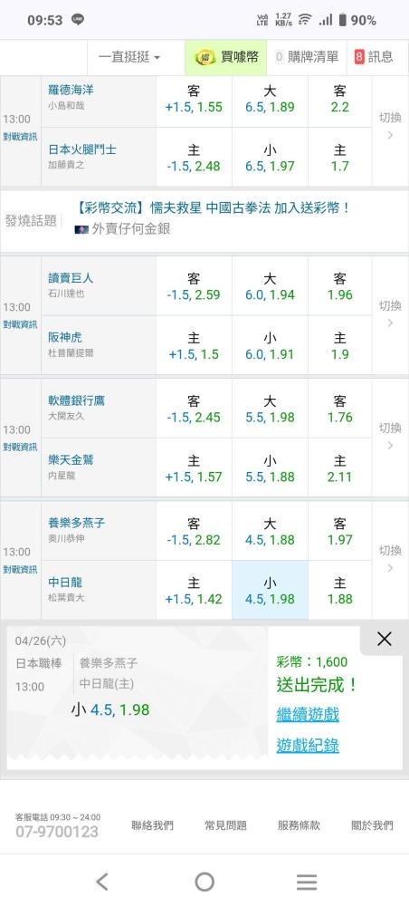 日本職棒 >> 雙盤主推連過4天國際連贏3天7/7贏錢爽歪歪!