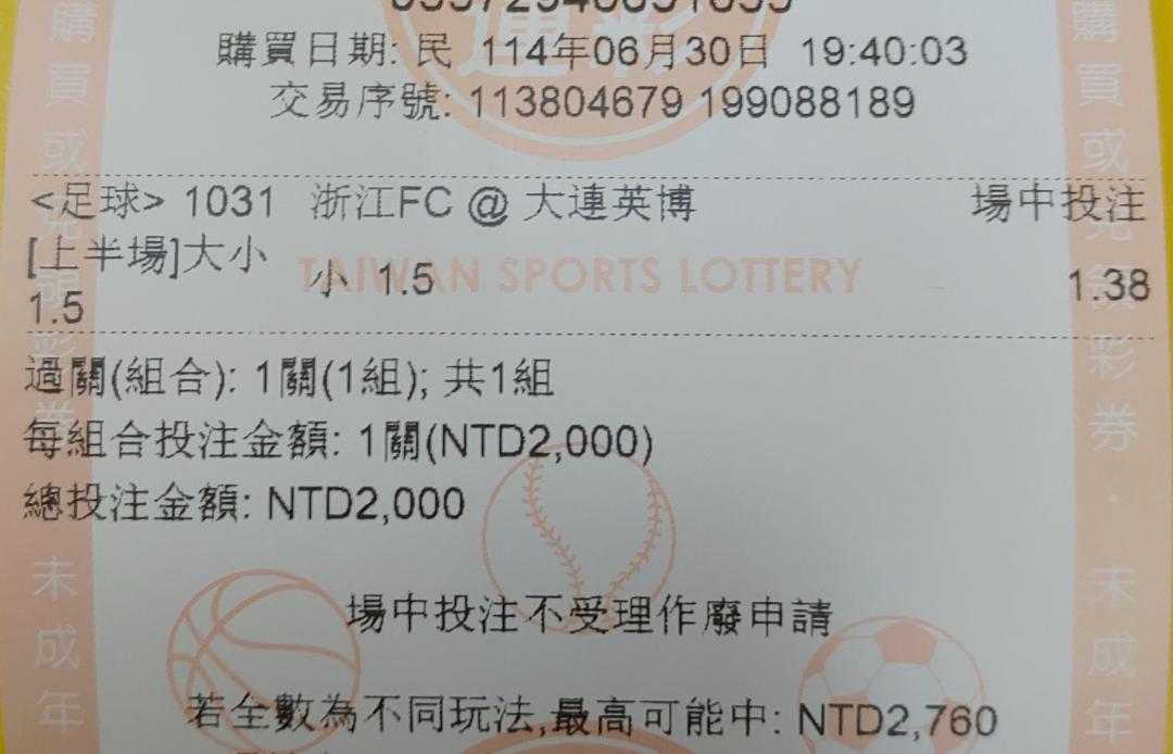 >> 6/30場中-大連vs浙江-上半場1.5小!!