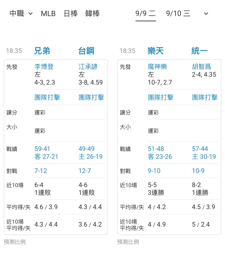 中華職棒 >> 9/9 中職 《先發投手名單》
