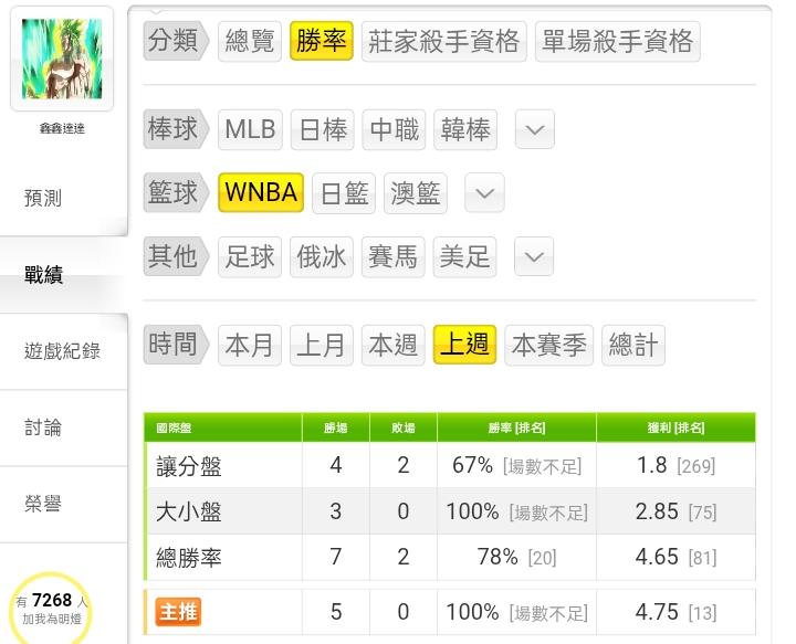 WNBA >> ⭐⭐[上週主推5勝0敗 勝率100%]明日主推台彩單場,信心主推99%貓場50倍注,贏錢跟上⭐⭐