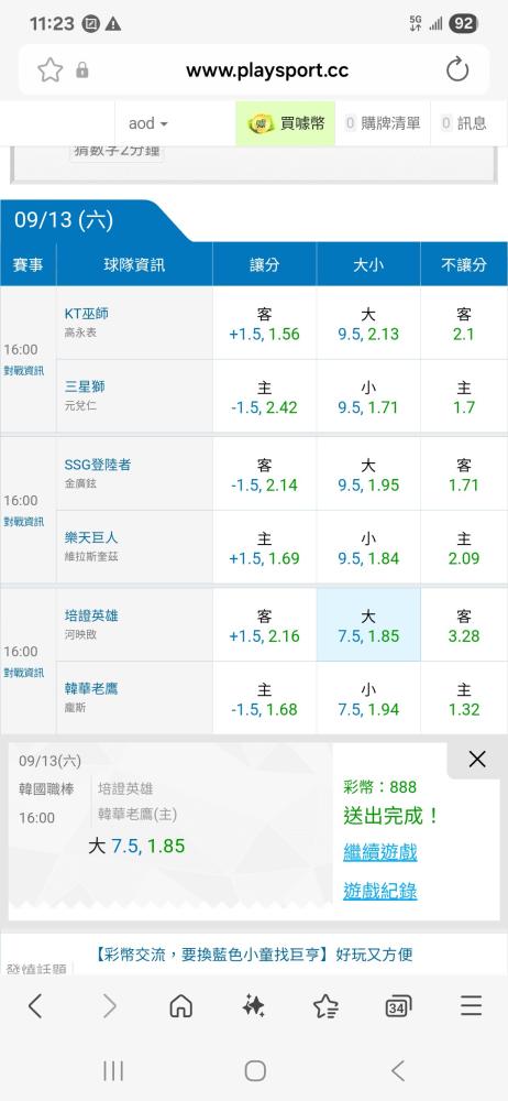 韓國職棒 >> 推一場免費,主推若沒有過下次免費,一起綠綠綠發發發旺旺旺