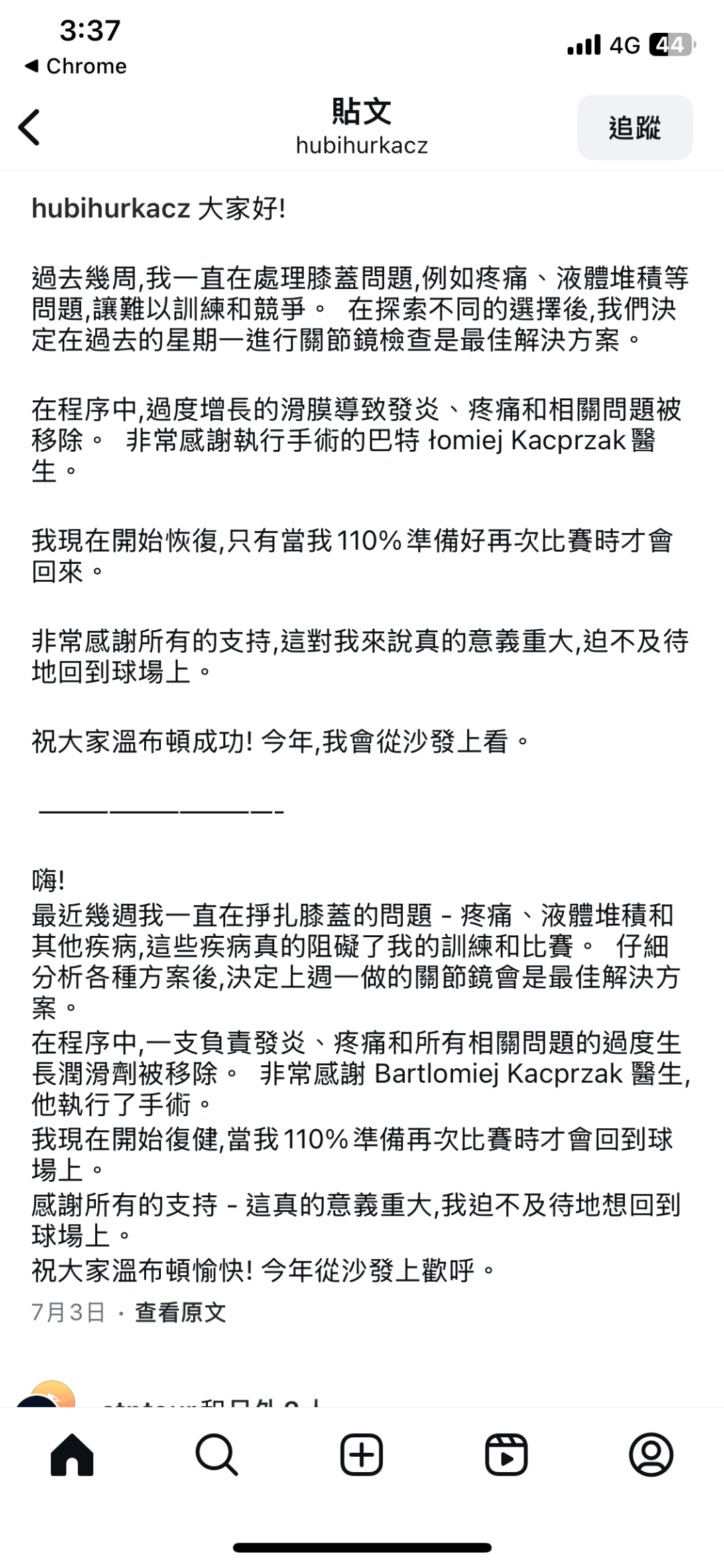 昨天第二盤打一半就抽筋,也跑不了,掰咖走路