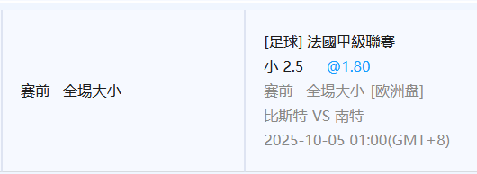 足球 >> 10/05【主推連過5天】【主推近13日過12】法甲小分推薦!