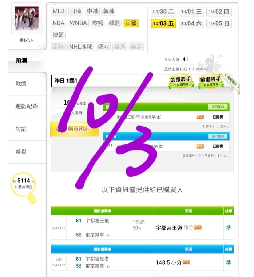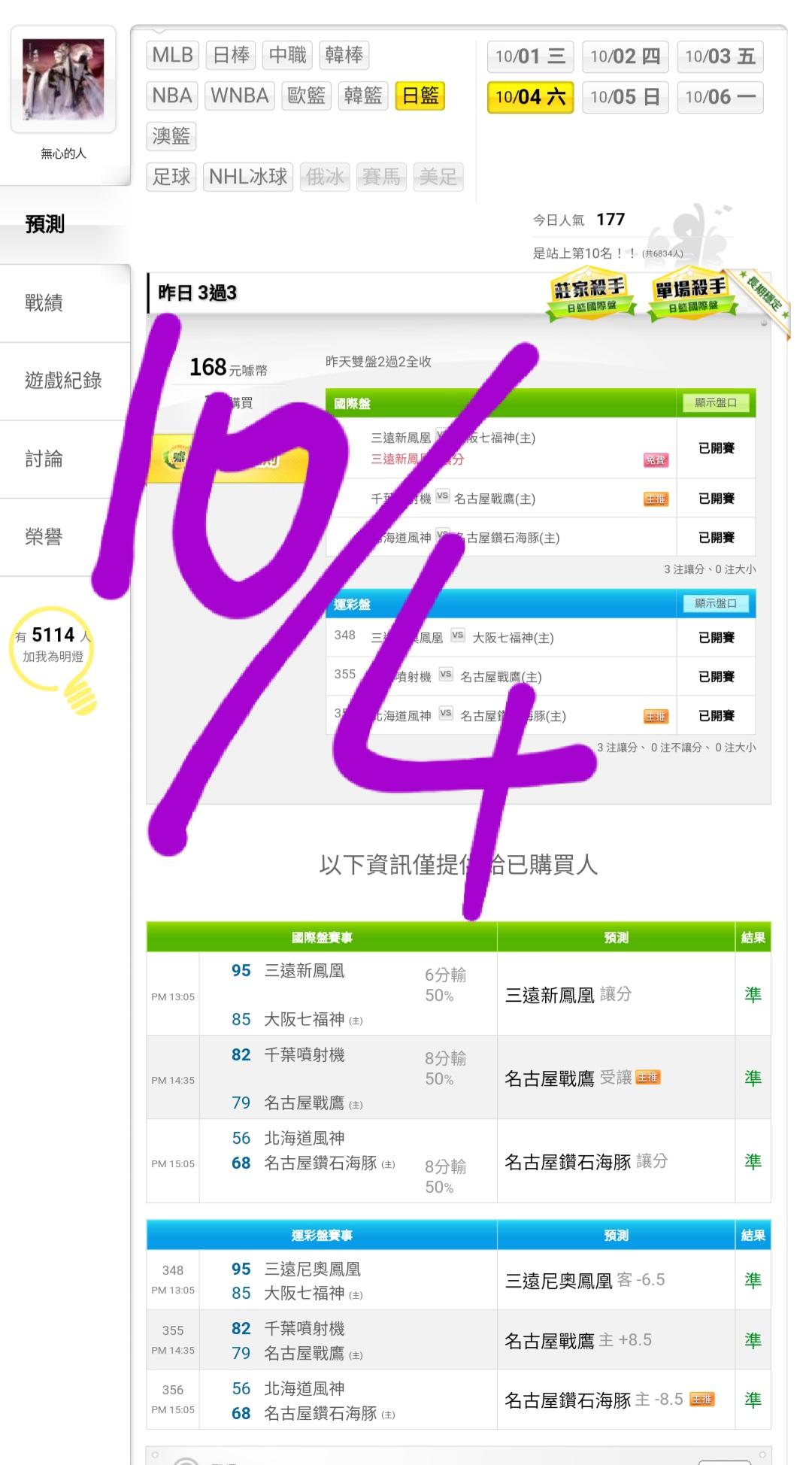 日本職籃 >> 昨天雙盤6過6全收~雙盤連贏2天8過8