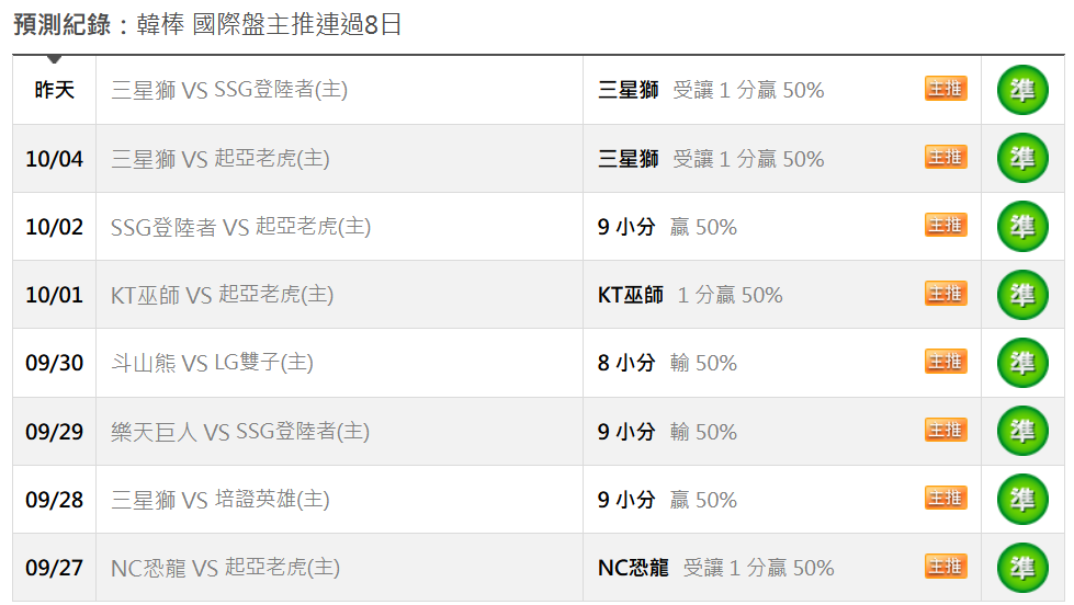 韓國職棒 >> 10/10【國際主推連過8天】【180期國際.運彩雙單殺】 初盤分享+上半場受讓推薦!
