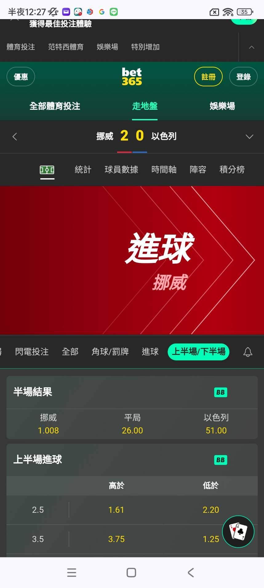 足球 >> 場中上半場3+ 買起來 挪威場