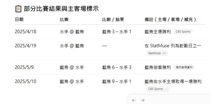 例行賽對戰藍鳥VS水手4勝2敗