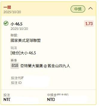 過關炫耀 >> 我開單關運彩,美式足球小分過盤啦!