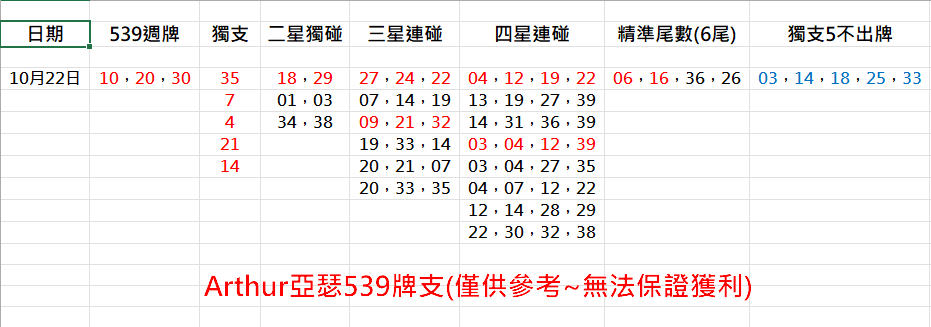 彩球 >> (10/22) 今彩539:數據參考★版路分析★(上期中30,13,22)