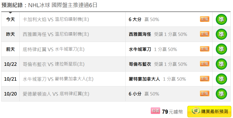 NHL冰球 >> 10/26【國際主推連過6天】【本週主推86%】讓分推薦!!