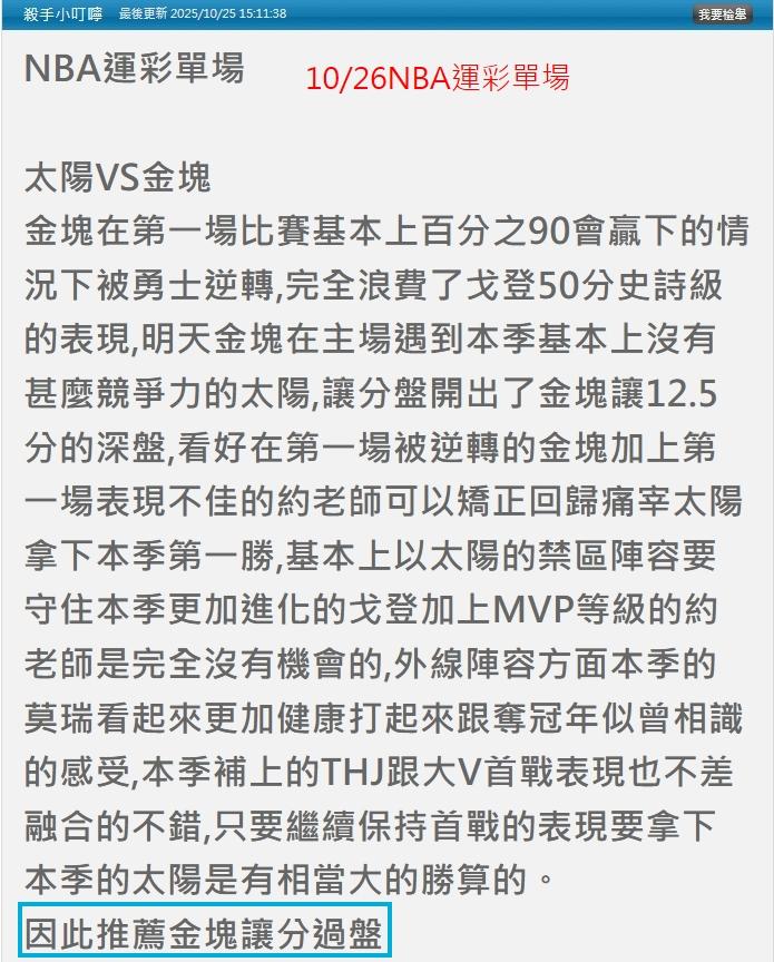 NBA >> [10/27NBA]本期剛出爐的國際&運彩莊殺 今天小叮嚀分析文推薦單場:金塊讓分順利抓到 明單場