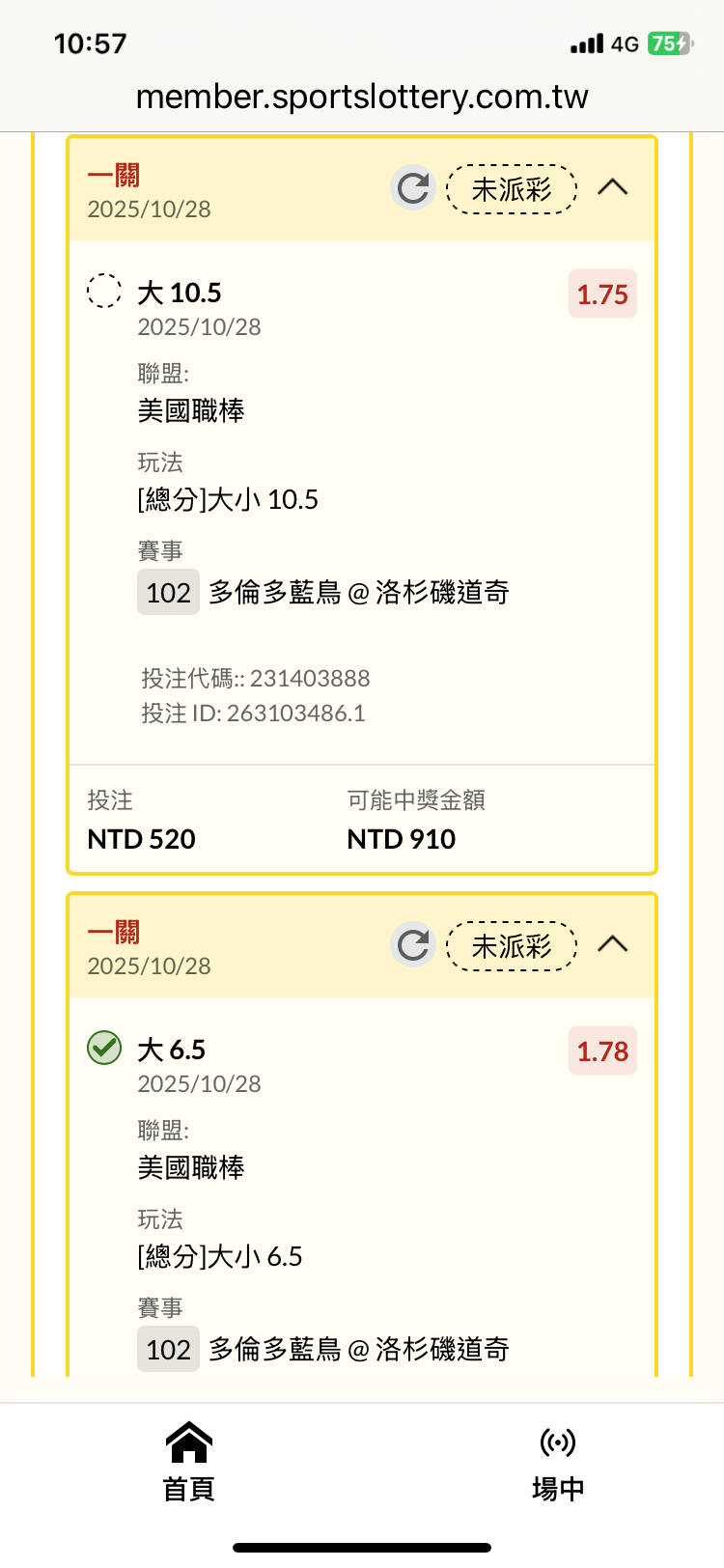 >> 10/28 MLB G3 大7.5/大8.5 只看總分啦