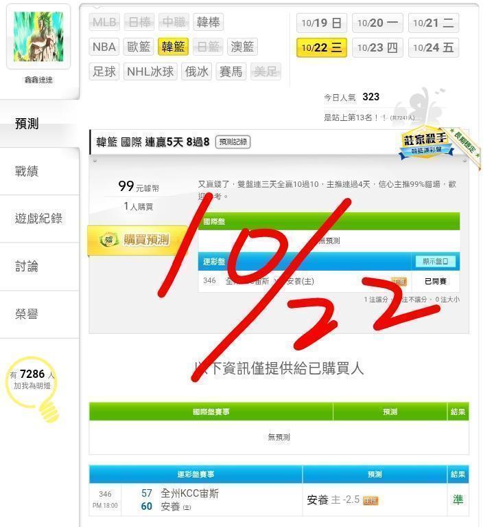昨日2過2,韓籃運彩近9日12過10勝率高達83%,一場輸贏,信心主推99%貓場,歡迎參考。