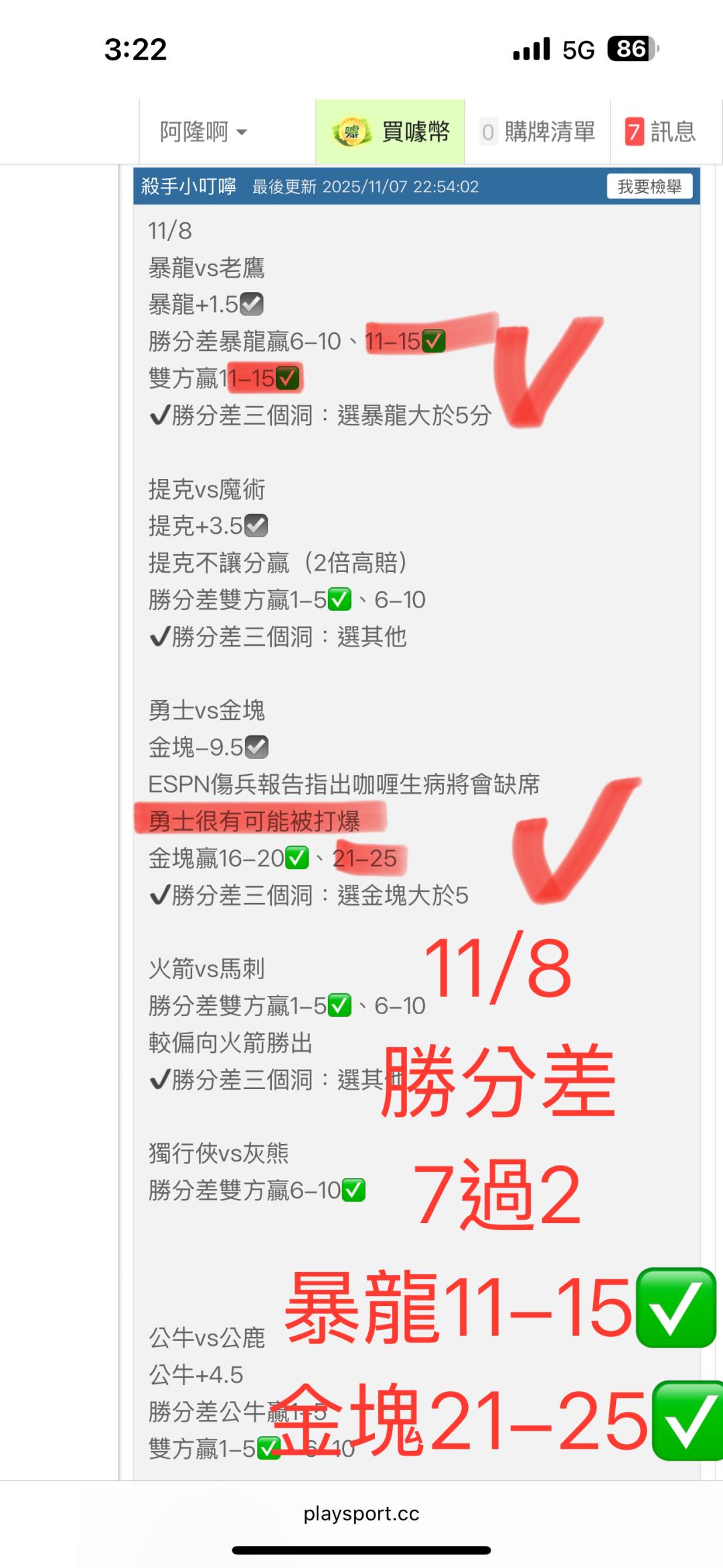 NBA >> 🏀11/9 NBA 今暴龍11-15、金塊21-25✅連續五天 命中勝分差 《太陽vs快艇》