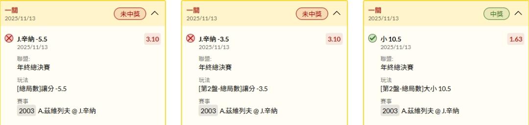 *11/13跟上面串關一起轟的三張、辛那v.s.阿茲場中10過8(最後兩單是賭高賠看5:2辛第七局保發第8局有沒有可能破發阿茲拿贏得摸)暫時有跟狗剛討回點子彈(球王爸爸的場很好抓感謝辛納幫我補血)。