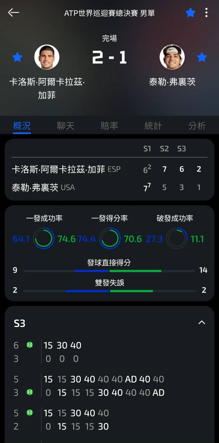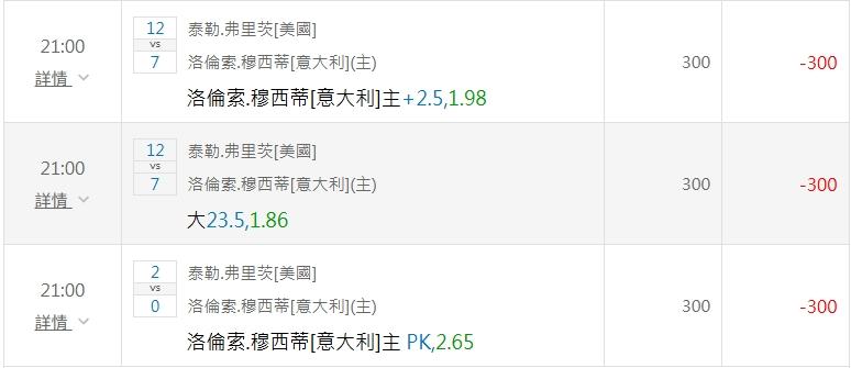 總結:前兩天輸得慘兮兮後兩天稍微追回來、但是其實就是均注買看比賽有一個參與感輸了就當門票錢、畢竟就是喜歡這項運動帶來的魅力,當然說輸錢不難過是不可能贏錢才是實在;賽前大方向能從選手近況跟歷史交鋒盤口數字稍微判斷、但是場中就真的是看應變跟膽識了。