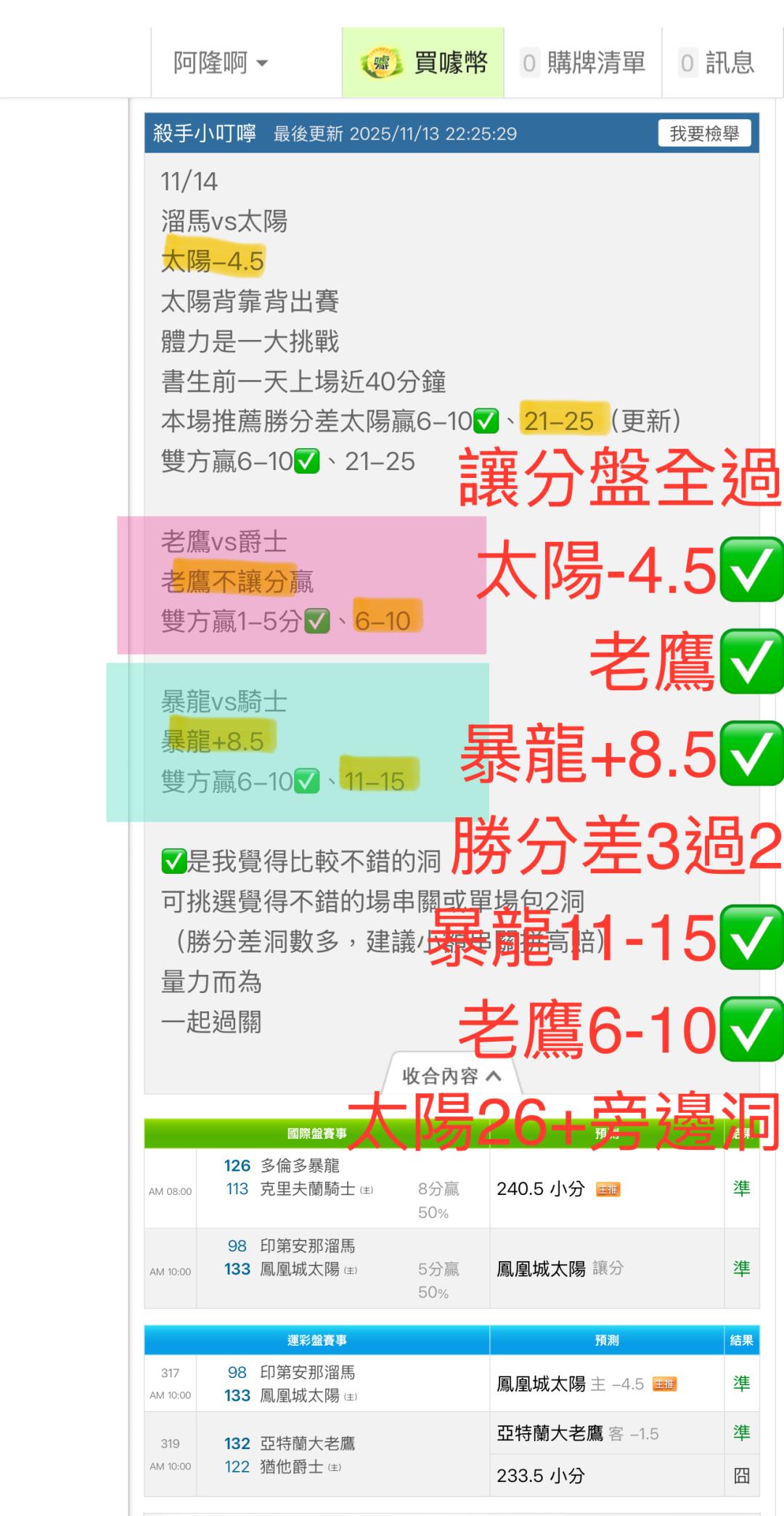 NBA >> 🏀11/15 NBA「連十一天皆有命中勝分差」NBA 國際大小 近5日6過5《勇士vs馬刺》 🌟