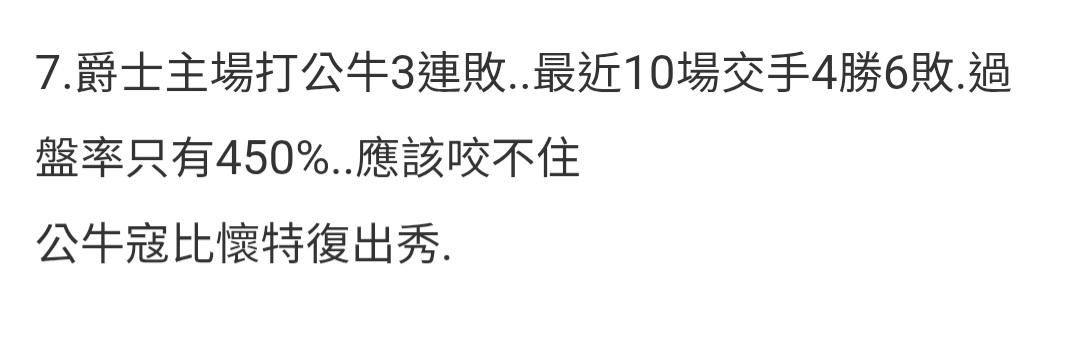 7.爵士主場打公牛3連敗..最近10場交手4勝6敗.過盤率只有450%..應該咬不住