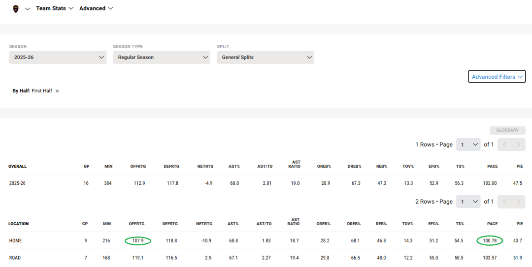 主場 9場 進攻效率 107.9 防守效率 118.8 節奏 100.78