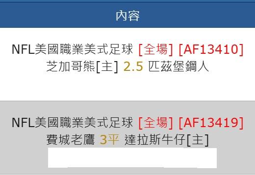 美式足球 >> [高信心場 二場決勝]-[凌晨2點 芝加哥熊V鋼人]+[台彩單場 牛仔V老鷹]-有信心 拚全過