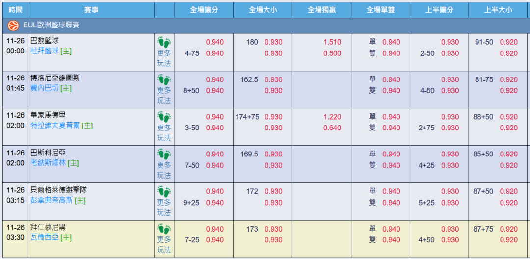 歐洲職籃 >> 11/26【國際主推近5過4】【國際大小 近4日5過4】初盤分享+杜拜讓分推薦!