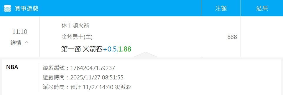 NBA >> 11/27 休士頓火箭 第一節 受讓+0.5