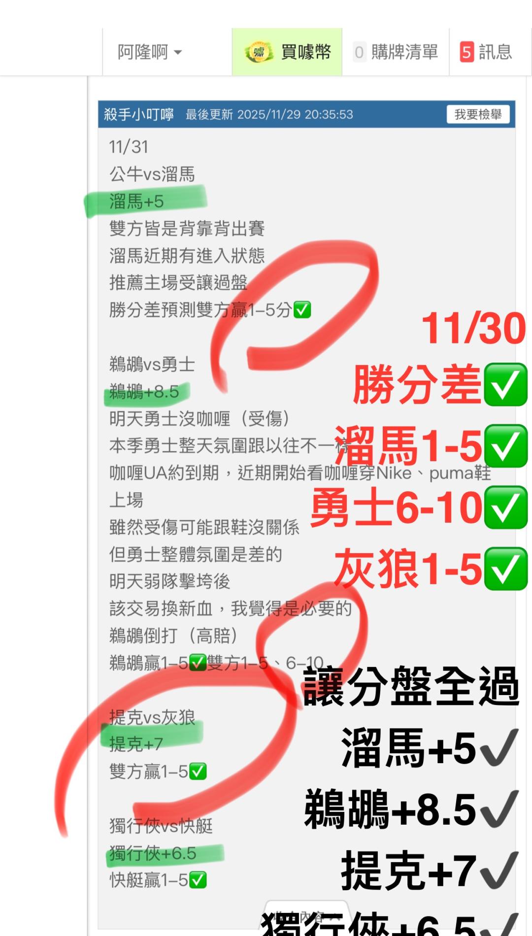 NBA >> 12/1🏀🌟NBA 運彩盤 近6日21過19《提克vs騎士》