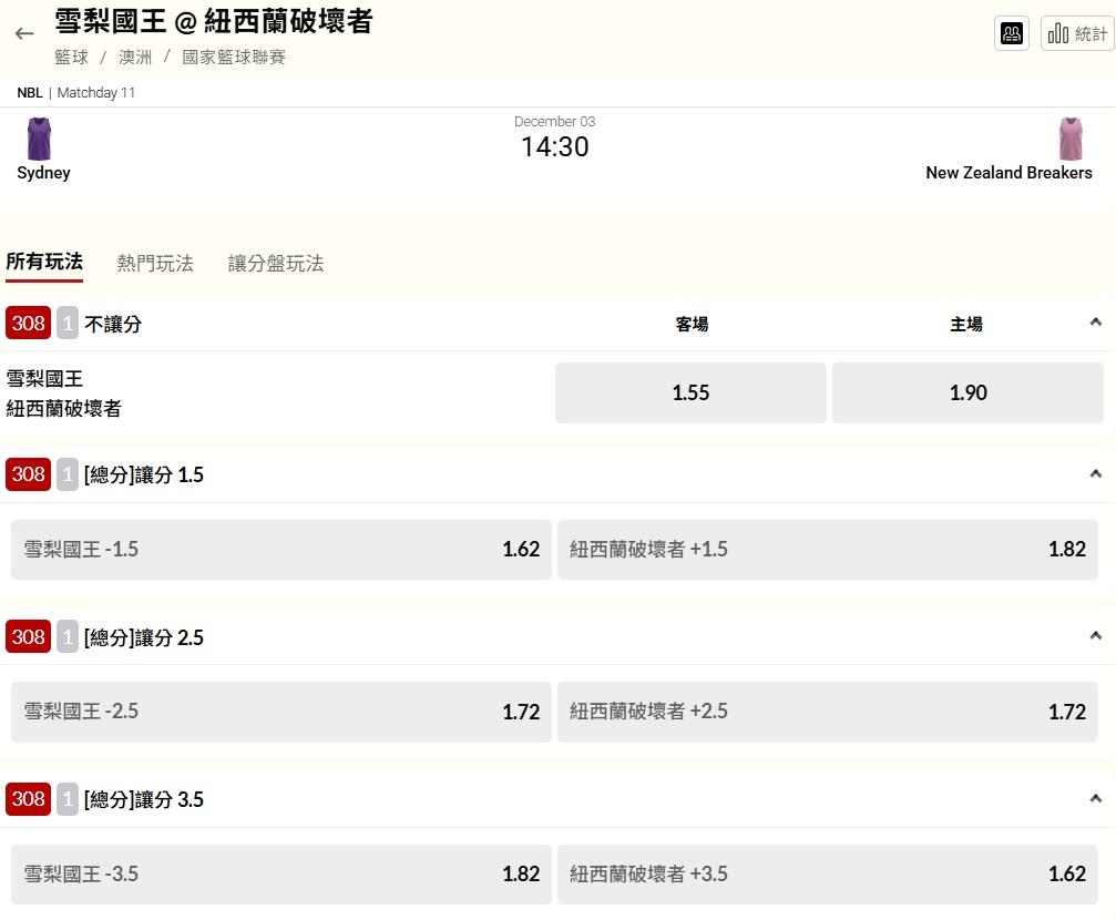澳洲職籃 >> 12/03 雪梨國王 V.S 紐西蘭破壞者