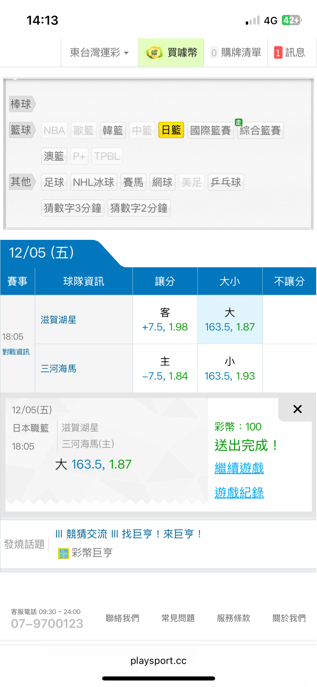 >> 12/5東台日籃國際盤【連贏6天20過15】主推信心滿滿(貓場)特價79- 拼日籃國際連贏7天~