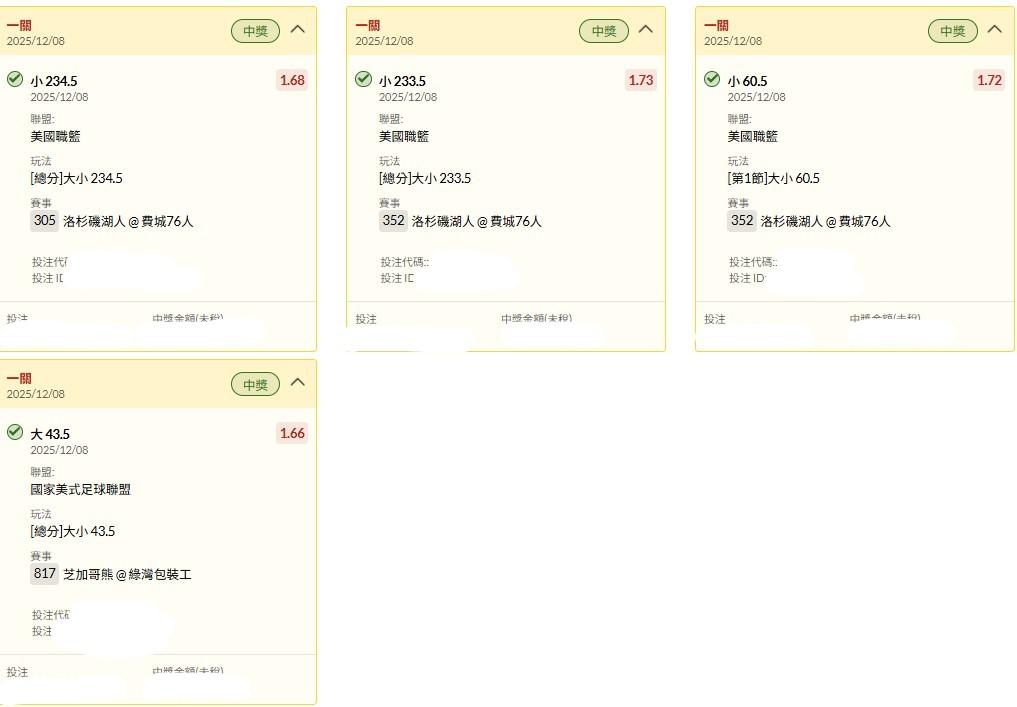 過關炫耀 >> 今天玩單關運彩,NBA第一節小分和總分小分過盤和美式足球大分過盤啦!