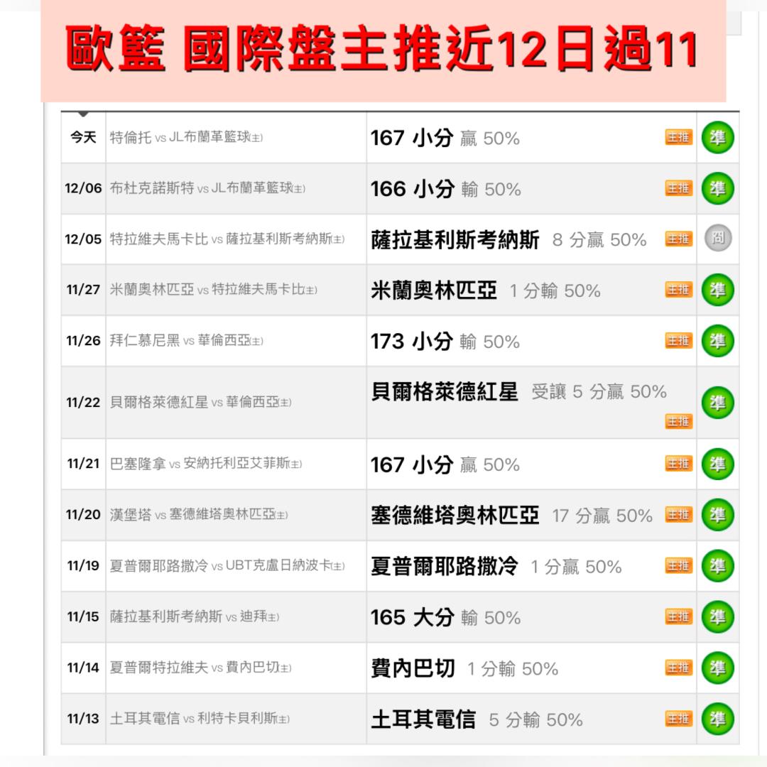 歐洲職籃 >> 12/11🏀🎑歐籃 國際盤主推近12日過11《克盧日大學 vs花園城市》