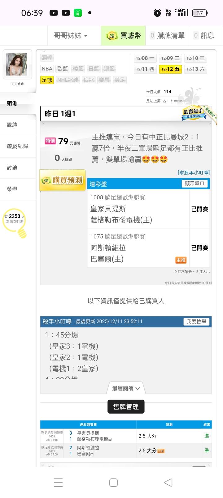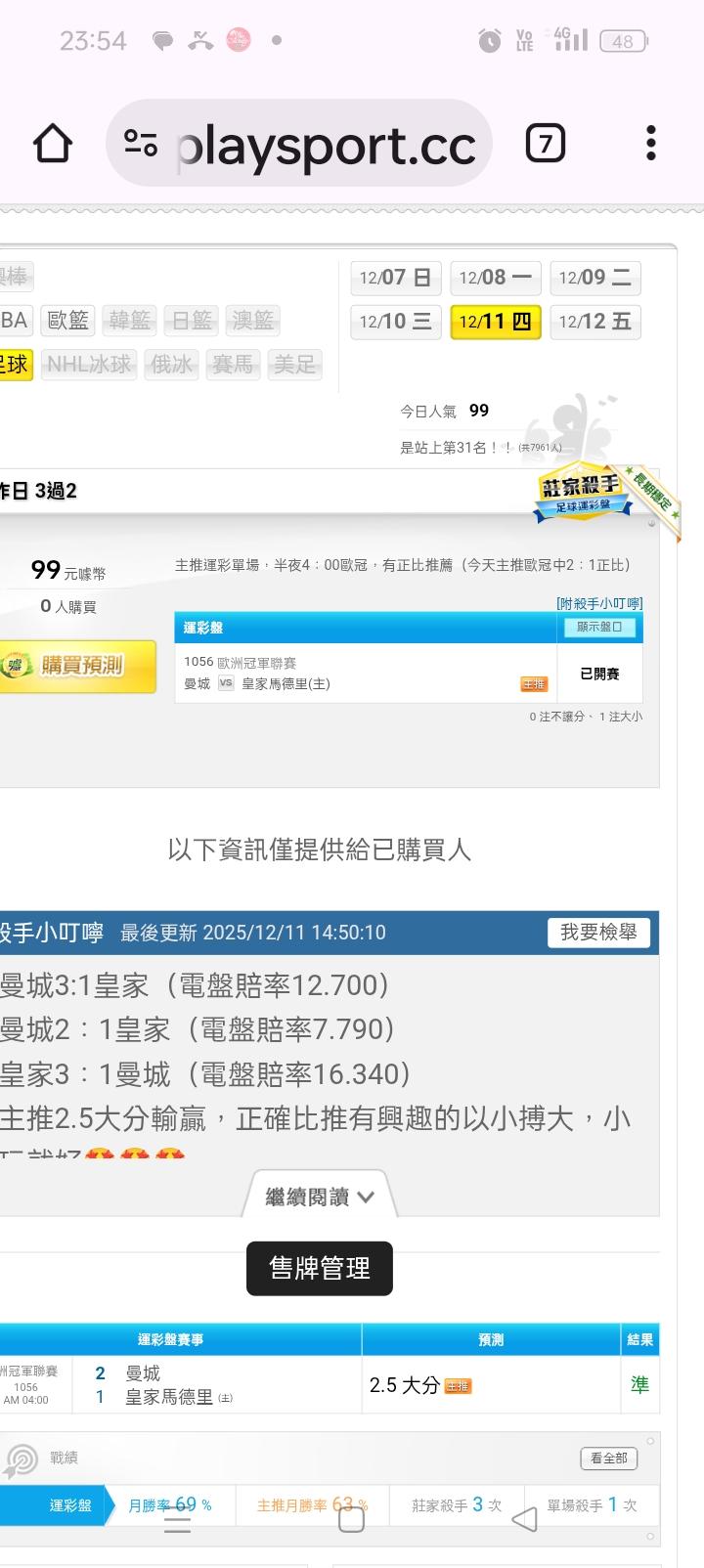 足球 >> 連續二天贏下正比推薦曼城2:1皇家3:1明天單場義大聯,一起來殺🤩