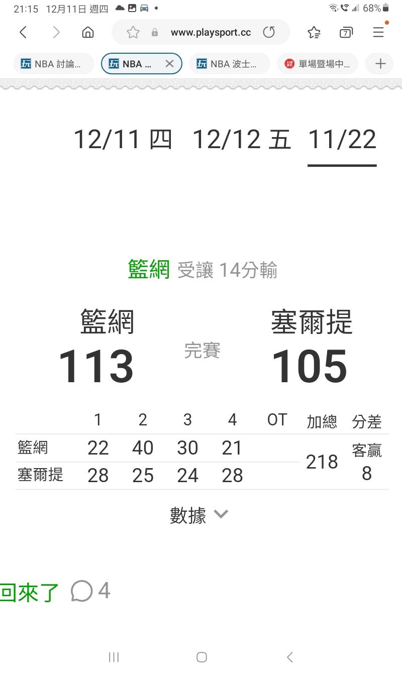 塞爾8連勝盤之前的一戰.11月22對籃網.塞爾提克讓14.5.主場被籃網倒打