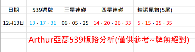 彩球 >> (12/13) 今彩539:數據參考★版路分析★(上期中35)