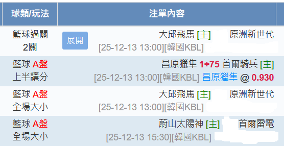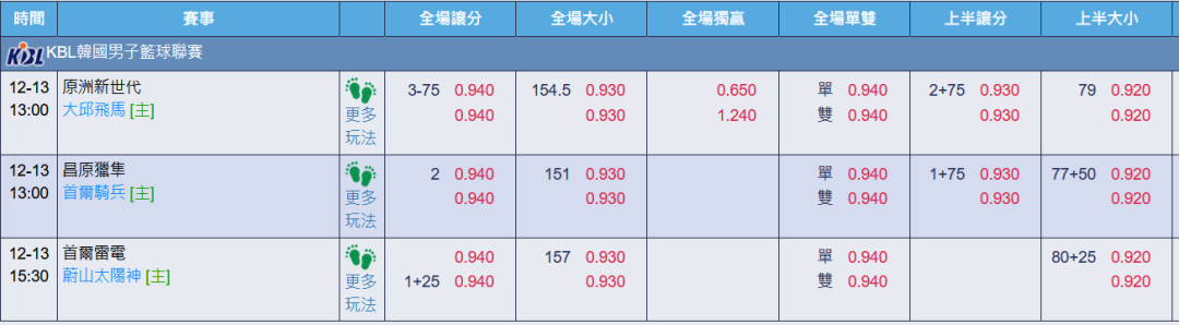 韓國職籃 >> 12/13【國際主推連過4天】13:00=初盤分享+上半場=昌原讓分推薦!!