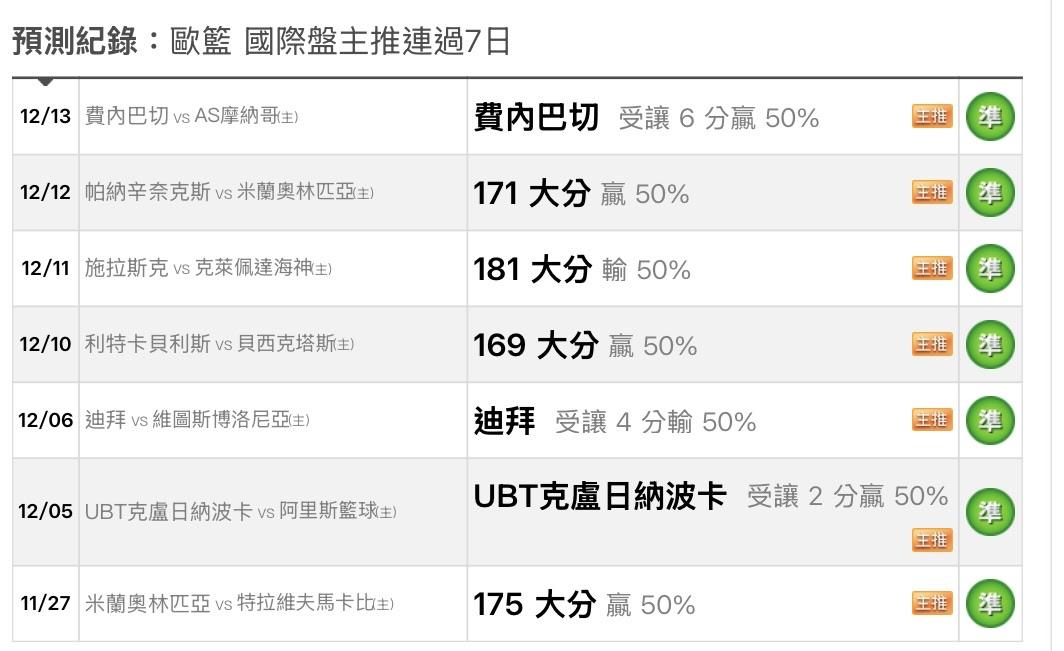 歐洲職籃 >> 🐈の國際主推連過7天勝率100趴 運彩主推連過4天 免費推薦2場