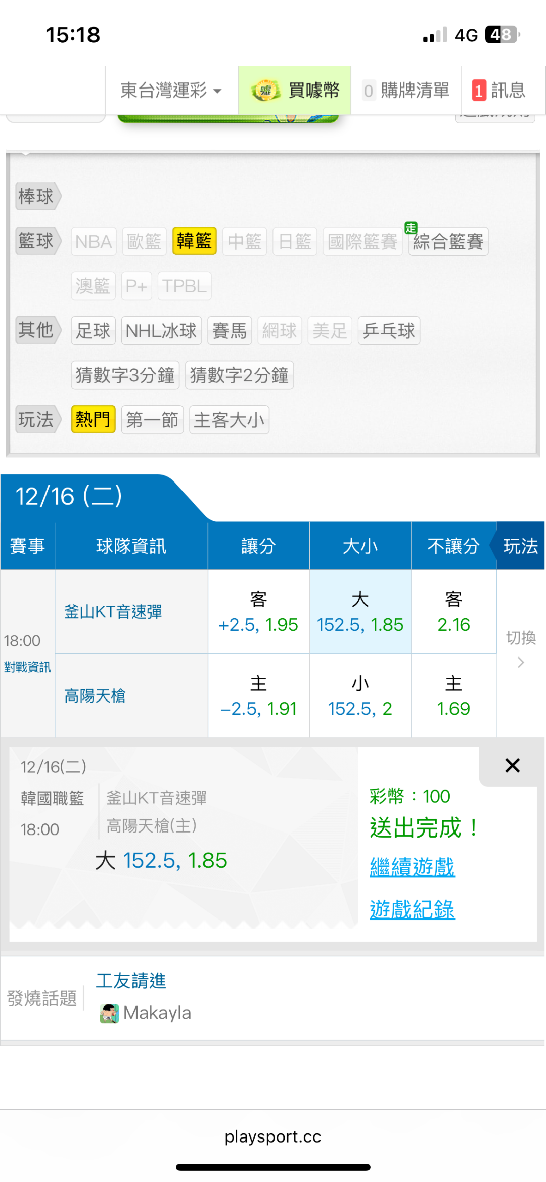 >> 12/16東台韓籃國際盤【連贏3天3過3】主推信心滿滿(貓場)特價79–拼韓籃國際連贏4天~