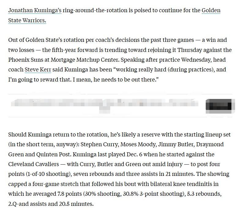 剛剛才看到這則新聞,Kuminga解凍回到輪換