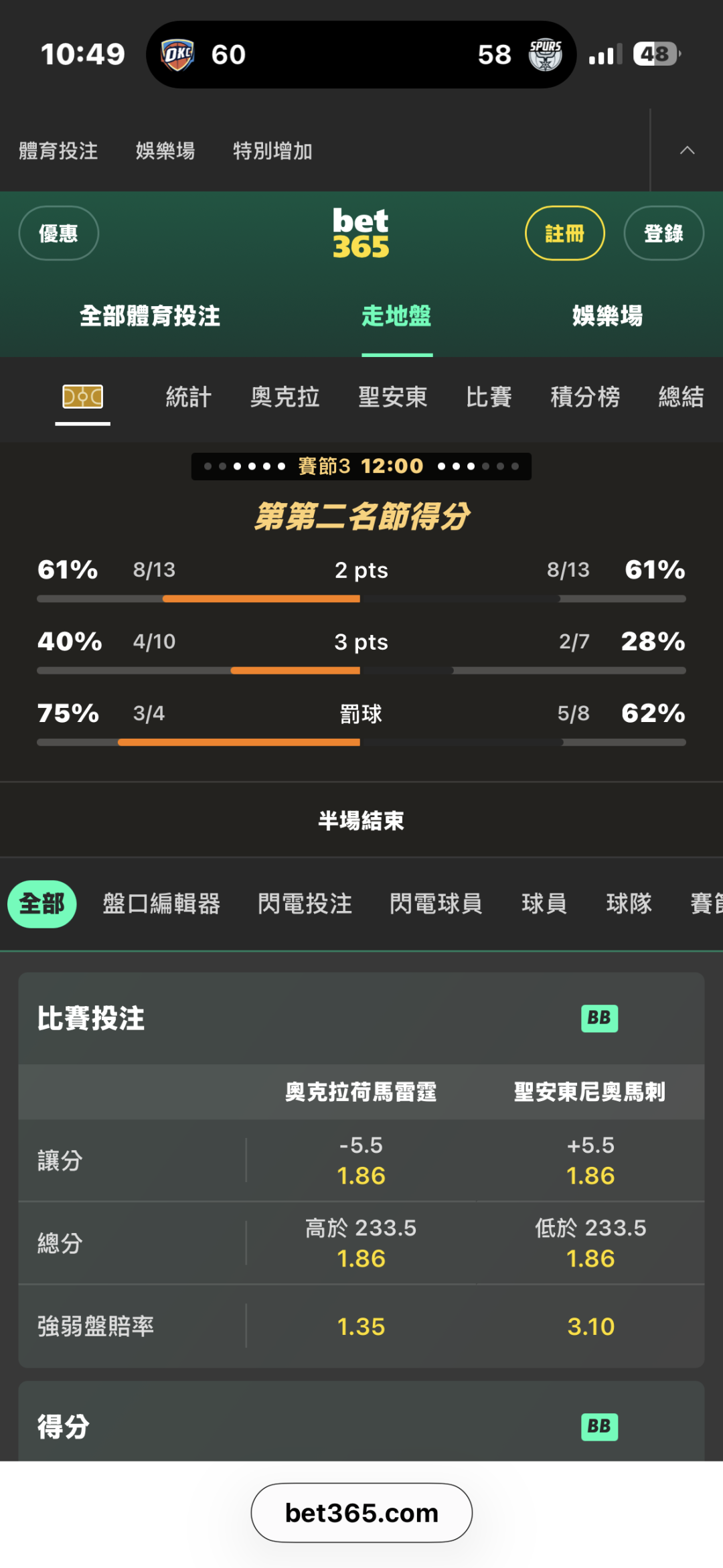 NBA >> 馬刺雷霆 (365開233.5 鳥綱236.5)