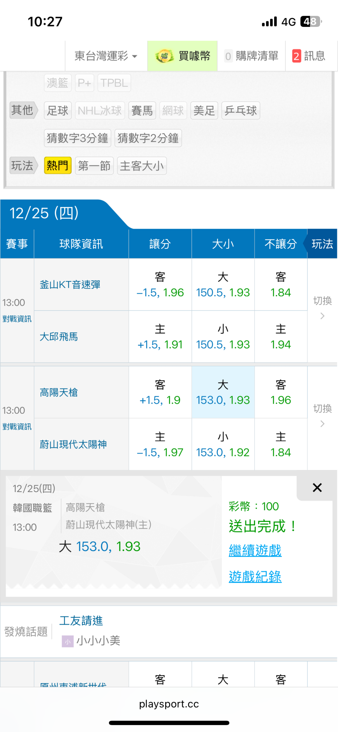 韓國職籃 >> 12/25東台韓籃國際盤【主推近11日過10】主推信心滿滿(貓場)均注獲利 特價用完了~