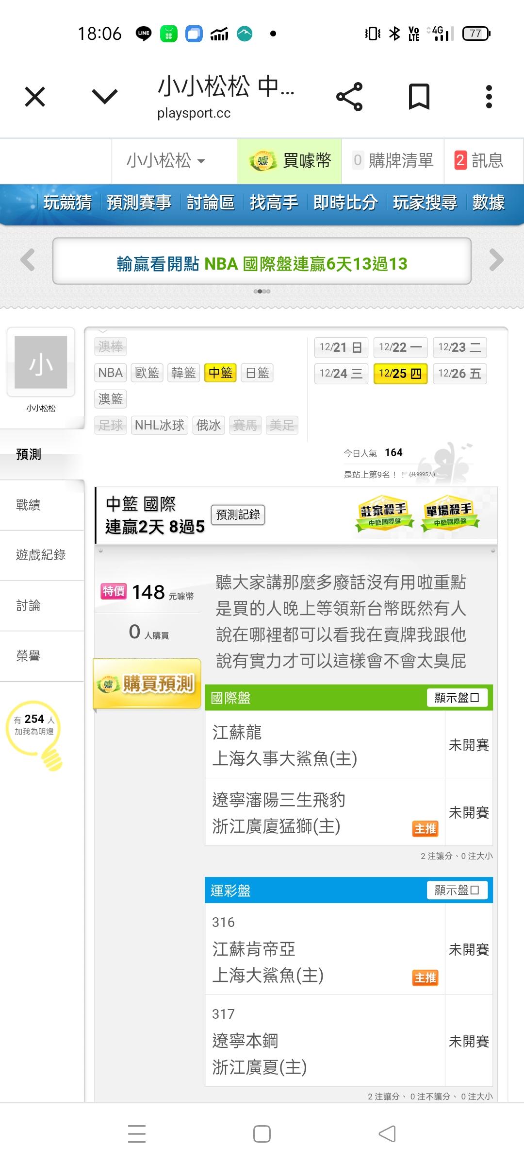 中國職籃 >> 我相當看好今天這兩場比賽感覺2場一起過盤的機率非常非常的高不報給你們知道對不起我的良心好好把握