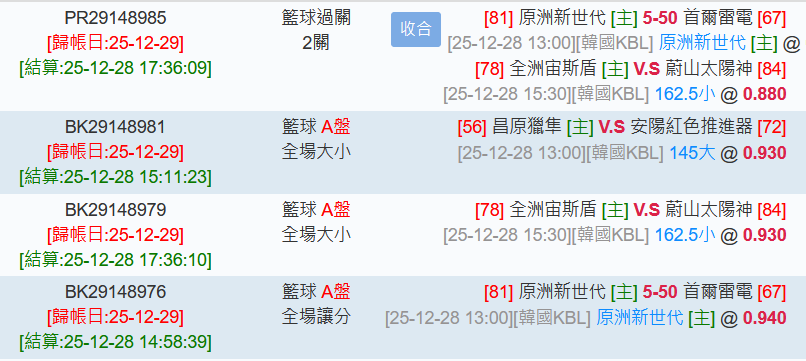 韓國職籃 >> 12/29【雙主推2天4過4】【小叮嚀2X1連過2天】18:00第一節大分推薦!!