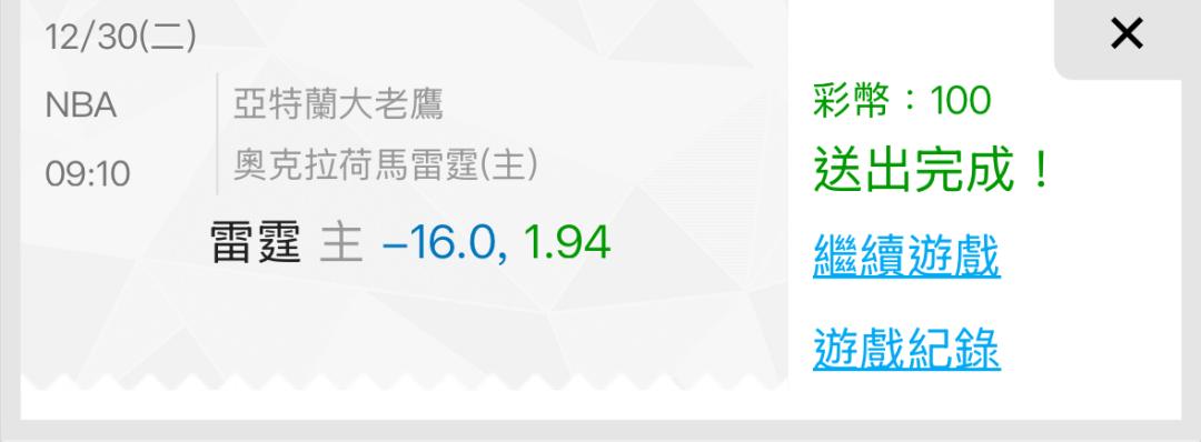 >> 12/30(二)老鷹vs雷霆(簡單的盤口分析)