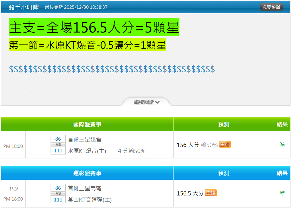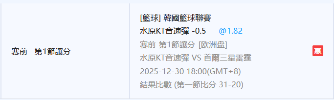 韓國職籃 >> 12/31【國際主推連過4天】【小叮嚀2注全過】台彩單場18:00第一節小分推薦!!