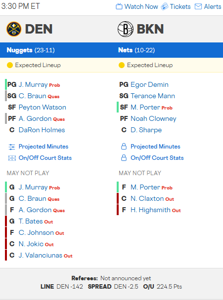 這場比賽金塊少了靈魂人物Jokic 和替補中鋒Valanciunas,等於禁區完全沒有大人,只能靠 Murray 單打獨鬥。而籃網雖然戰績不佳,但陣容相對健康,且擁有MPJ這種頂級得分手以及充滿活力的年輕禁區(Sharpe/Clowney)。