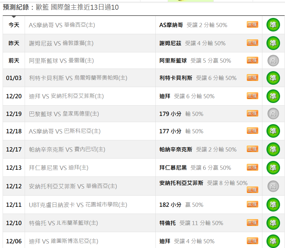 歐洲職籃 >> 1/10【國際主推近13日過10】【國際連贏2天6過4】02:00受讓推薦!