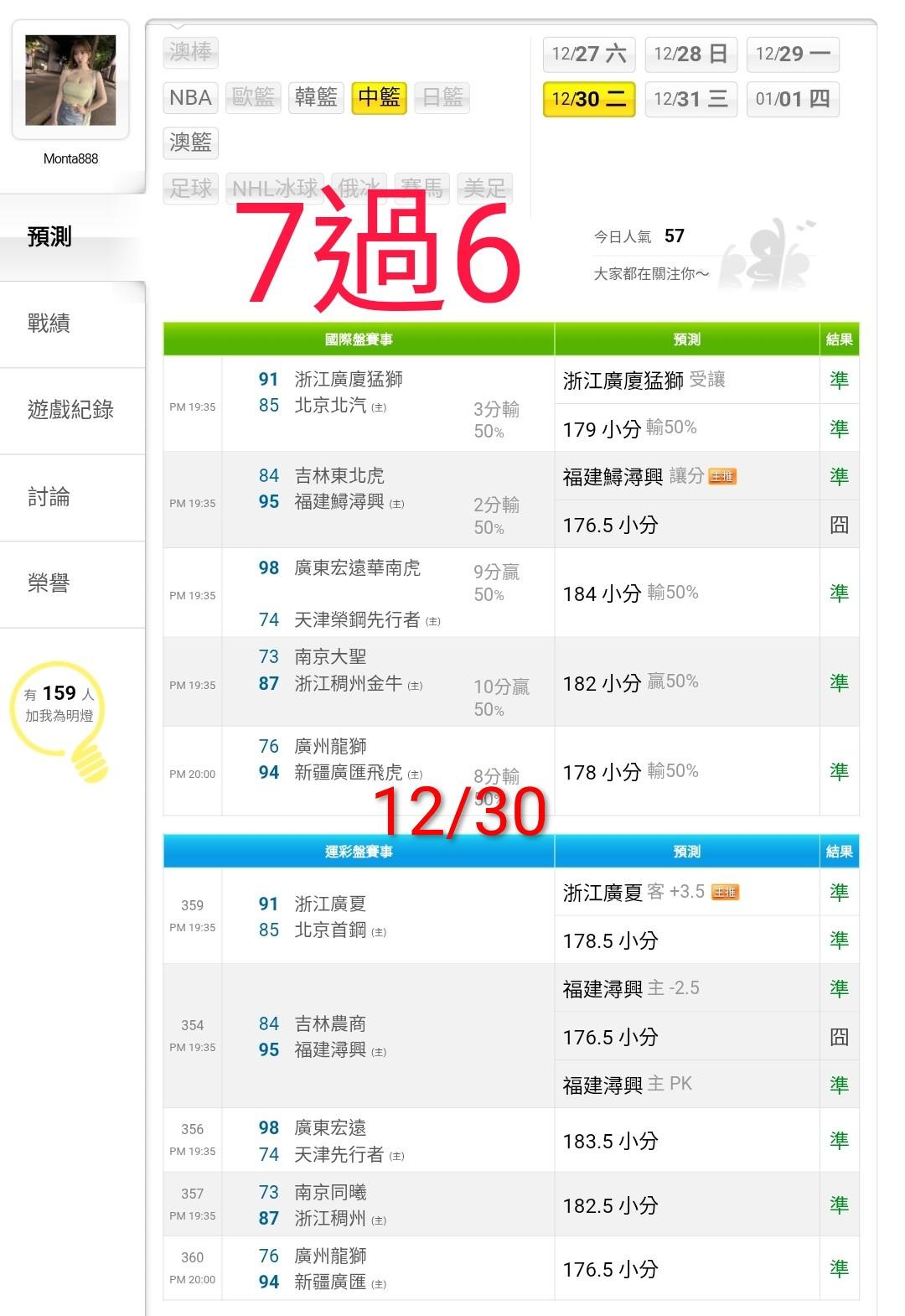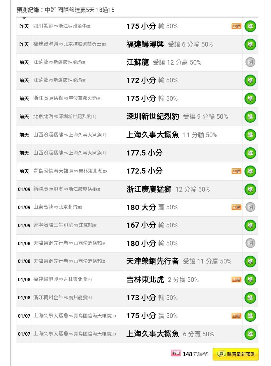 中國職籃 >> 贏快半桶了~運彩盤【近14日 53過41 目前連贏7天 26過20】~運彩主推【近19日過15】