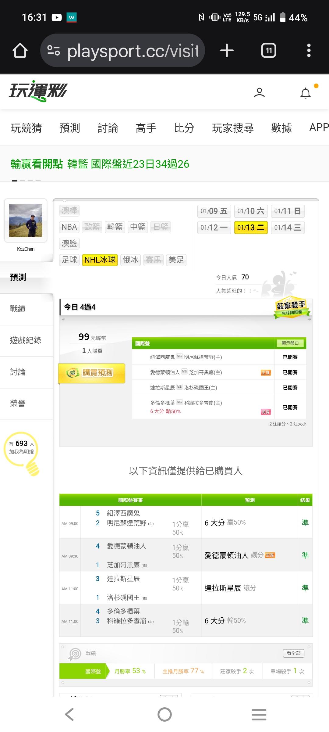 NHL冰球 >> 今天4過4,明天推薦一場
